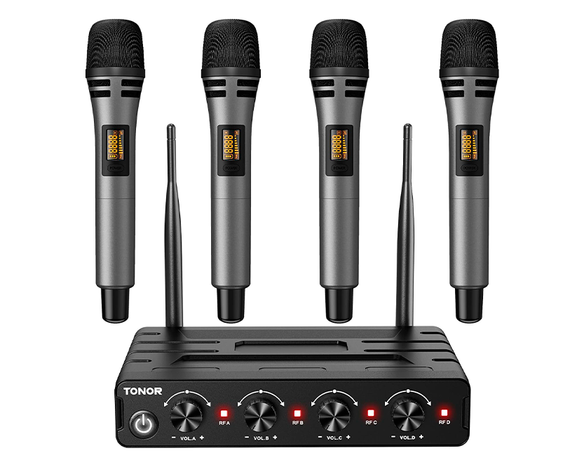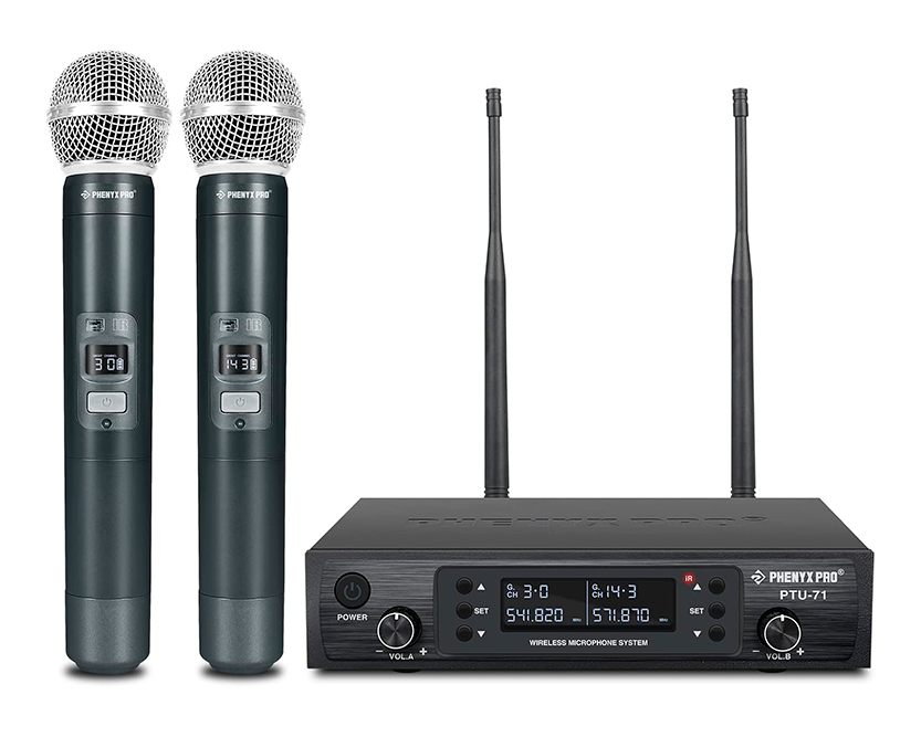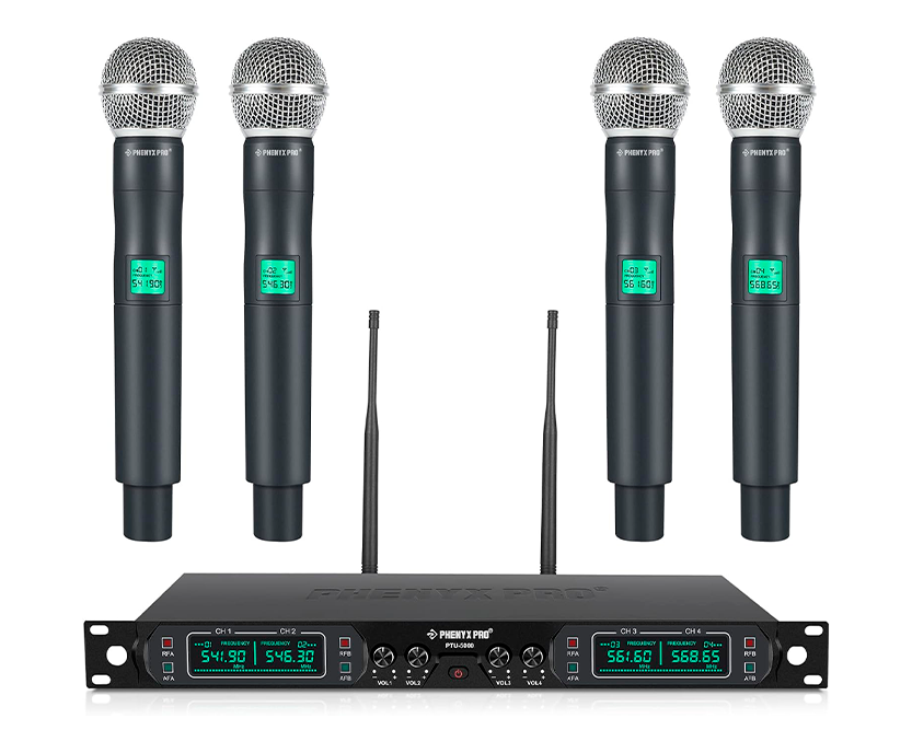 Por último te presentamos el micrófono Phenyx Pro PTU-5000-4H, un sistema pensado para grupos o presentaciones con varias personas, permitiendo utilizar varios micrófonos a la vez con buena estabilidad de señal.